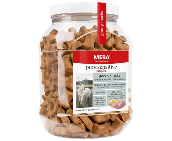 Biscuiti Caini MERA Goody Curcan si Cartofi 600g reprezinta o hrana complementara, hipoalergenica pentru caini adulti, din ingrediente de buna calitate. Pot constitui un snack sau o recompensa potrivita pentru catei sensibili sau cu alergii. Chiar si cainii sensibili merita o recompensa! Biscuitii din gama Pure Sensitive sunt ideali pentru dresaj sau ca o mica recompensa intre mese. Avand curcanul ca unica sursa de proteina animala digerabila plus cartofi usor digerabili, reteta Mera are doar ingrediente fara gluten. Snack-urile gustoase Mera Goody sunt create in concordanta cu principiile Dietei cu Ingrediente Limitate (Limited Ingredient Diet - L.I.D.) pentru caini sensibili. Astfel sunt reduse la minim riscurile intolerantelor si alergiilor alimentare la caini. COMPOZITIE: Fulgi de cartofi (60%), proteina din carne curcan (33%), grasime de pasare, clorura de sodiu (sare de bucatarie), lignoceluloza, inulina din cicoare (0.1%). CONSTITUENTI ANALITICI: Proteine 24%, grasimi 8%, fibre 2%, cenusa bruta 7%. ADITIVI KG: Aditivi nutritionali: Vitamina A 5.000UI, Vitamina D3 500UI, Vitamin E 50mg. Aditivi tehnologici: antioxidanti. Biscuitii Mera Goody constituie o gustare care trebuie sa fie complementara alimentatiei zilnice de baza a cainelui. Se recomanda ajustarea ratiei zilnice din hrana de baza in functie de cresterea portiei de biscuiti. Ca si parte integranta a unui concept nutritional holistic, snack-urile din gama Goody Pure Sensitive sunt o completare la hrana uscata si umeda. Intreaga gama Pure Sensitive ofera diferite arome astfel incat cainele dumneavoastra sa se poata bucura de o dieta variata. In functie de varsta sau anumite nevoi speciale, gama ofera si retete bazate pe carne proaspata, cu un continut proteic ridicat. MERA este o companie germana cu o istorie de aproape 70 de ani in productia de hrana pentru animalele de companie. Fabrica MERA foloseste tehnologie de ultima ora, si toate produsele MERA sunt rezoltatul cercetarii si inovatiei. MERA este, momentan, cel mai important producator european de biscuiti pentru caini. Biscuitii MERA sunt potriviti pentru cainii de orice talie sau varsta, si pentru orice nivel de activitate. Biscuitii folosesc ingrediente de calitate, sunt plini de vitamine si minerale, si nu contin conservanti si coloranti artificiali.