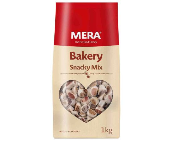 BISCUITII MERA Bakery Snacky Mix, 1 kg reprezinta o hrana complementara pentru caini adulti, din ingrediente de buna calitate. Compozitie: cereale, carne si produse animale secundare, produse vegetale secundare, uleiuri si grasimi, substante minerale, peste si produse secundare din peste, zahar. Constituenti analitici: Proteine 16%, Continut de grasimi 8%, Fibre brute 2%, Cenusa bruta 5.5%. Aditivi nutritionali: Vitamina A 5000 UI, Vitamina D3 500 UI, Vitamine E 50 mg.
