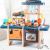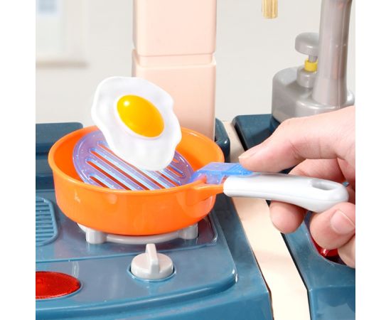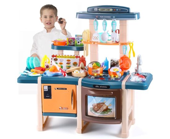 Aragazul are doua zone de gatit si scoate sunete si lumini atunci cand este folosit. Langa acesta este chiuveta, iar la o apasare de buton apa va curge exact ca la robinet.