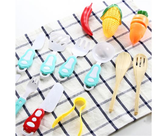 In set sunt incluse toate accesoriile de care micii bucatari au nevoie precum si materie prima pentru gatit (oua, peste, legume).