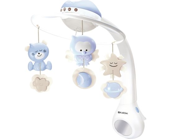 Carusel musical pentru patut bebelusi, Karemi, cu proiector 3 in 1, cu oglinda incorporata, temporizator, melodii linistitoare, albastru