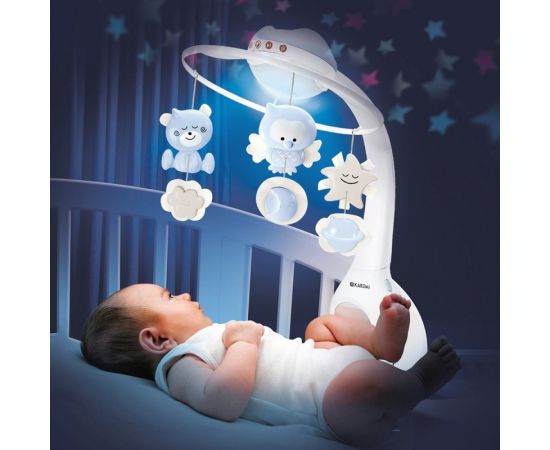 Calmeaza-l si linisteste-l pe micul tau visator cu proiectorul muzical 3 in 1 . Exista trei etape de utilizare a acestui proiector. Etapa 1: melodii linistitoare, lumini blande si personaje dragute. Etapa 2: Caruselul muzical poate fi indepartat pentru ca proiectorul luminos sa poata fi montat pe patut, care emite modele instelate pe perete si reda cantece de leagan selectate de experti. Etapa 3: proiectorul poate fi indepartat de pe suportul pentru patut si poate fi asezat pe o comoda pentru a emite modele instelate pe tavan.