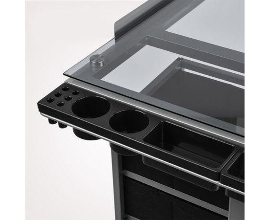 • Statie multifunctionala cu blat de lucru din sticla securizata.
