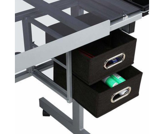 Sub masa se afla doua sertare extensibile, iar ambele parti au mai multe optiuni de depozitare practice pentru stilouri, creioane, pensule, rigle si alte accesorii creative.