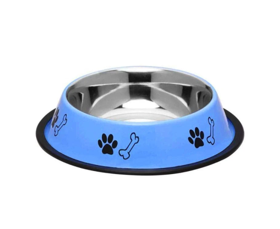 Castron din inox pentru caini cu exterior albastru si inel de cauciuc antiderapant. Inelul de cauciuc previne alunecarea casatronului pe podea, atat in interiorul locuintei cat si in exteriorul acesteia. In plus, diminueaza zgomotul produs de animal in timpul folosiri. Poate fi utilizat atat pentru hrana (umeda sau uscata) cat si pentru lichide. Este inoxidabil, usor de curatat, nu modifica gustul alimentelor si nu retine mirosul acestora. Datorita designului bolului, animalul nu poate varsa mancarea in timp ce mananca. Capacitate: 1900 ml. Diametru: 22 cm.