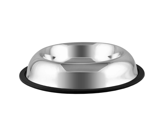 Castron din inox pentru caini, cu inel de cauciuc antiderapant. Inelul de cauciuc previne alunecarea casatronului pe podea, atat in interiorul locuintei cat si in exteriorul acesteia. In plus, diminueaza zgomotul produs de animal in timpul folosiri. Poate fi utilizat atat pentru hrana (umeda sau uscata), cat si pentru lichide. Este inoxidabil, usor de curatat, nu modifica gustul alimentelor si nu retine mirosul acestora. Datorita designului bolului, animalul nu poate varsa mancarea in timp ce mananca. Capacitate: 480 ml. Diametru: 15,5 cm.