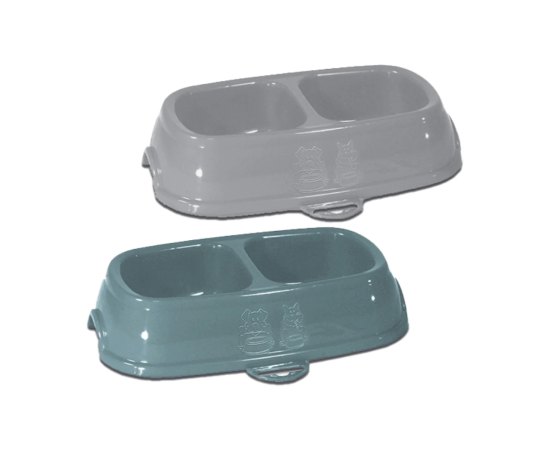 Castron dublu din plastic pentru caini sau pisici. Poate fi utilizat atat pentru hrana (umeda sau uscata) cat si pentru lichide. Este usor de curatat, nu modifica gustul alimentelor si nu retine mirosul acestora. Capacitate: 2 x 0,25 L.