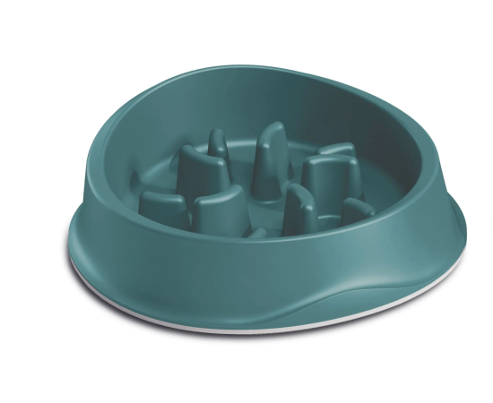 Castron anti-inghitire pentru caini si pisici cu margine de cauciuc anti-alunecare. Incetineste aportul de hrana si promoveaza o digestie corecta. Potrivit pentru contactul cu alimentele. Dimensiuni: 20,5x20,5x6,5h cm