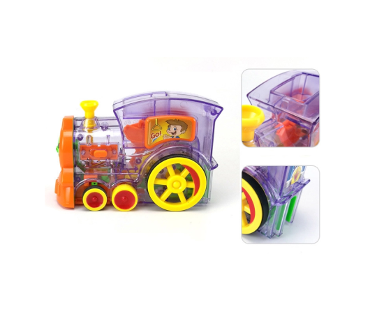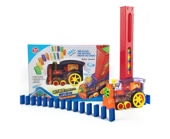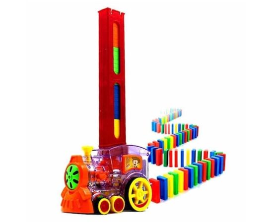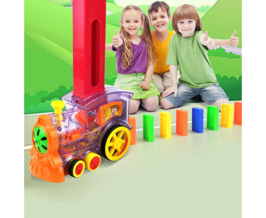 Trenuletul electric emite sunete si lumini, are un design placut si elibereaza piesele domino unul cate unul.