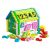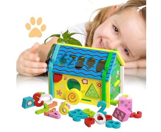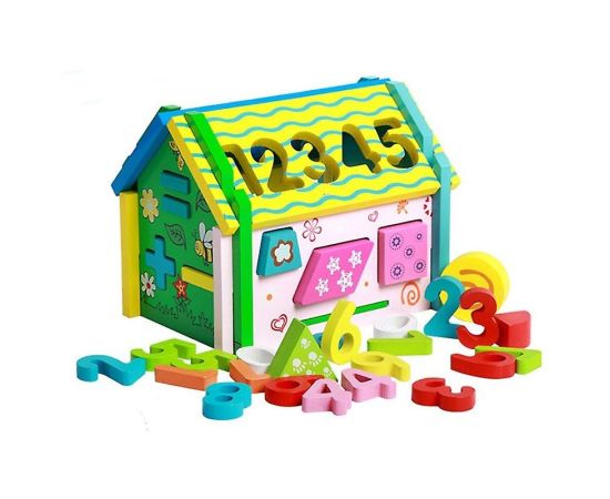 Casuta din lemn colorata cu maner Karemi , bile, figurine, forme geometrice si cifre