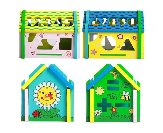 Pachetul contine: jucarie motricitate, casuta din lemn colorata cu maner , bile, ciocanel, figurine, forme geometrice si cifre, poate fi usor manevrata de cei mici.