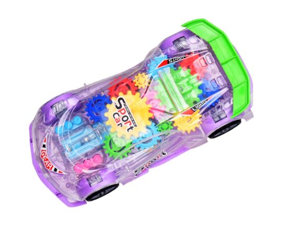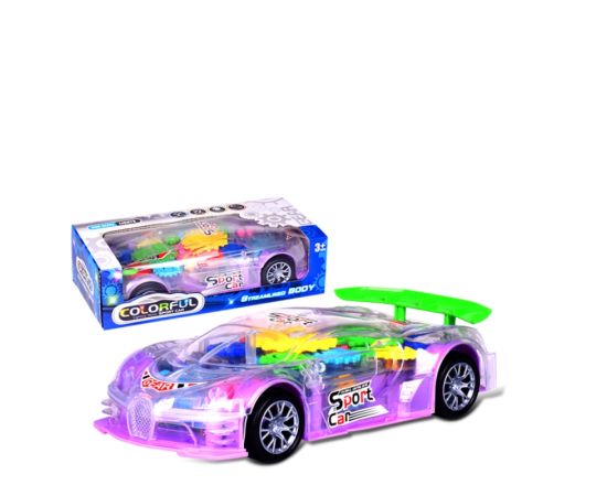 Masina cu lumini si sunete este fabricat integral din plastic, de culoare transparenta. Are lumini interne multicolore, geamuri transparente si roti cu miscare libera.