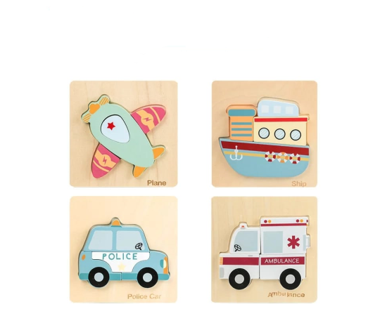 Set-ul de 4 puzzle-uri din lemn este perfect pentru dezvoltarea coordonarii mana-ochi, a concentrarii si a rationamentului logic. Realizat din material din lemn cu 4 modele de mijloace de transport diferite. Fiecare puzzle contine patru piese din lemn.