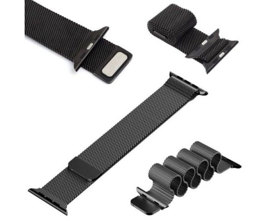 Această bratara este destinata utilizatorilor de Apple Watch 1/2/3/4/5 fiind de culoare neagra. Datorita constructiei formate din zale mici, bratara se muleaza perfect pe orice incheietura, prinderea fiind asigurata de un magnet puternic, neexistand riscul ca aceasta sa se desfaca.