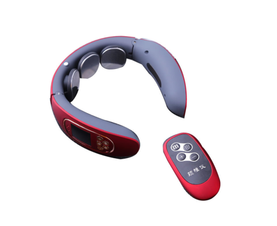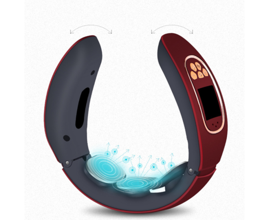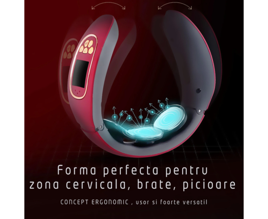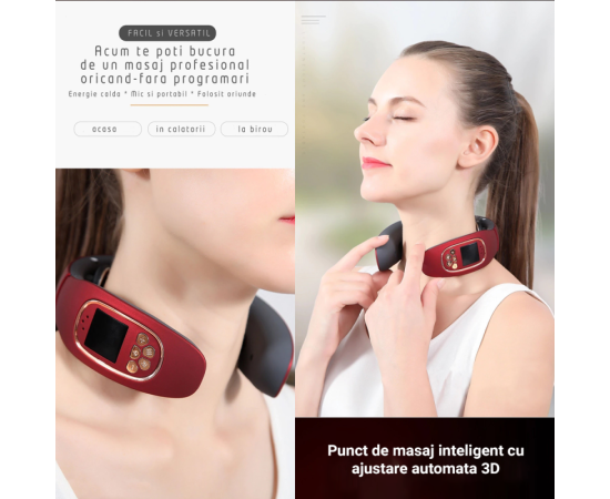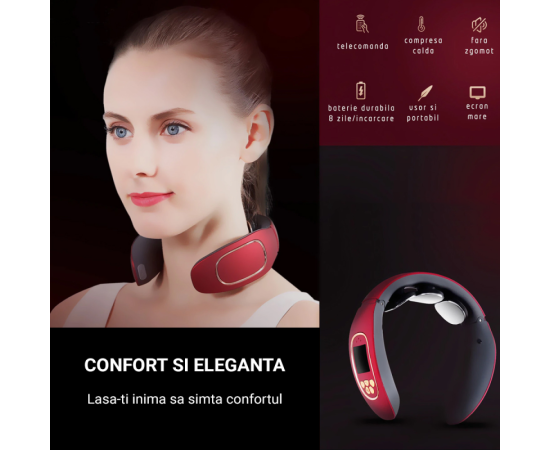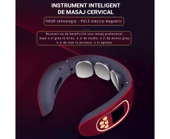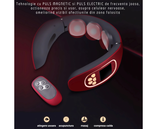 Dispozitiv de masaj cervical Lila Care, cu telecomanda, puls electro-magnetic, vibratii si functii de incalzire, rosu-negru, 4 moduri de masaj