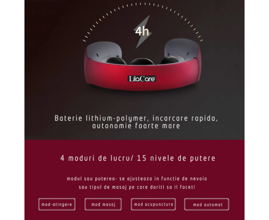 Dispozitiv de masaj cervical Lila Care, actioneaza precis asupra celuleor nervoase din zona de actiune, ameliorind vizibil, durearea sau discomfortul, cauzat de inflamarea acestor receptori. Cu acest dispozitiv, va puteti bucura de beneficiile unui masaj profesional, dupa o zi grea, la birou, o zi de studiu, o zi de munca grea(fizica), o zi de stat in picioare, etc. Dispune de o telecomanda si un display , care va arata parametrii de functionare si prin intermediul careia, puteti seta modul de lucru, in functie de nevoi si 2 pad-uri care se pot conecta la aparat(cu un cablu de 1.2 metri) si le puteti pozitiona in orice zona a corpului doriti beneficiind astfel de functiile aparatului , pe orice zona a corpului aveti nevoie. Designul futurist, materialele calitative si multi-functionalitatea, il fac sa fie un produs complet si extrem de util.