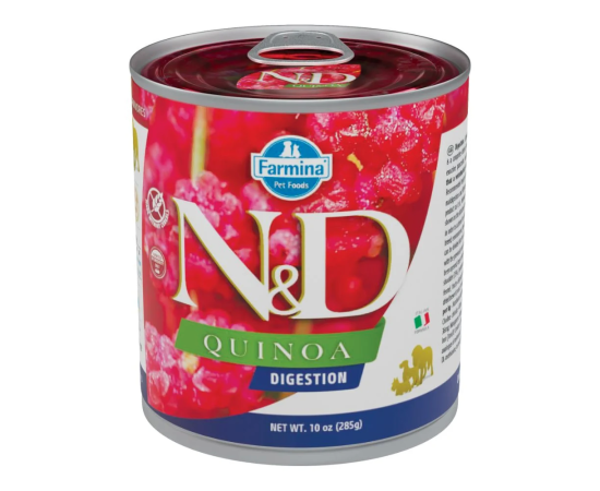 ND Quinoa Digestive Adult 285g este o hrana umeda completa pentru cainii adulti. Ingrediente Hrana Umeda Caini ND Quinoa Digestive Adult 285g: Miel (35%), proteina hidrolizata din peste, extract de seminte de quinoa (5%), ulei de peste, anghinare, fenicul, fructo-oligozaharide, extract de drojdie (sursa de mano-oligo-zaharide), bere uscata, sulfat de condroitina , glucozamina, vitamine, minerale. COMPONENTE ANALITICE: Umiditate 75,00%; proteina bruta 10,40%; grasime bruta 3,80%; fibre brute 0,90%; cenusa bruta 3,30%. ADITIVI NUTRITIONALI: Vitamina A 4000UI; Vitamina D3 400UI; Vitamina E 130 mg; clorura de colina 400 mg; Zinc (chelat de zinc al analogului hidroxi al metioninei): 36 mg; Mangan (chelat de mangan al analogului hidroxi al metioninei): 6,8 mg; Fier [chelat de fier (II) al glicinei hidrat]: 16,8 mg; Cupru (chelat de cupru al analogului hidroxi al metioninei): 2,9 mg; Seleniu (drojdie de seleniu inactivata): 0,00242mg; DL-metionina, tehnic pura 1800 mg; taurina 500 mg; L-carnitina 150 mg. Aditivi organoleptici: extract de ceai verde 50 mg.