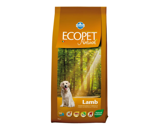 ECOPET NATURAL Adult Medium Miel 12kg este o hrana uscata completa destinata cainilor adulti de talie medie cu carne de miel. Ingrediente Hrana Uscata Caini ECOPET NATURAL Adult Medium Miel 12kg: Orez, porumb, carne de pui deshidratata, carne de miel deshidratata (10%), grasime de pui, faina de peste, pulpa de sfecla deshidratata, ulei de peste, ulei vegetal, clorura de sodiu, drojdie de bere deshidratata, extract de radacina de cicoare (0,4%), MOS din extract de Saccharomyces Cerevisiae (0,4%). ADITIVI NUTRITIONALI: Vitamina A 10000 IU; Vitamina D3 1000 IU; Vitamina E (alfa-tocopherol 91%) 100mg; Vitamina C 100mg; Niacina 25mg; acid pantotenic 10mg; Vitamina B2 5mg; Vitamina B6 4mg; Vitamina B1 3mg; Vitamina K3 (M.S.B. 53%) 1mg; Vitamina H 0,25mg; acid folic 0,30mg; Vitamina B12 0,04mg; clorura de colina 1500mg; Zn-oxid de zinc 108mg; Zn-sulfat de zinc monohidrat 120mg; Mn-sulfat de mangan monohidrat 150mg; Fe-sulfat de fier monohidrat 44mg; Fe-carbonat de fier 60mg; Cu-sulfat de cupru pentahidrat 50mg; I-iodura de calciu anhidra 2,4mg; Se-selenit de sodiu 0,22mg; DL-metionina 1500mg. ANALIZA NUTRITIONALA: proteina 24%, grasimi 12%, fibre 2,7%, cenusa 8%, umiditate 9%.