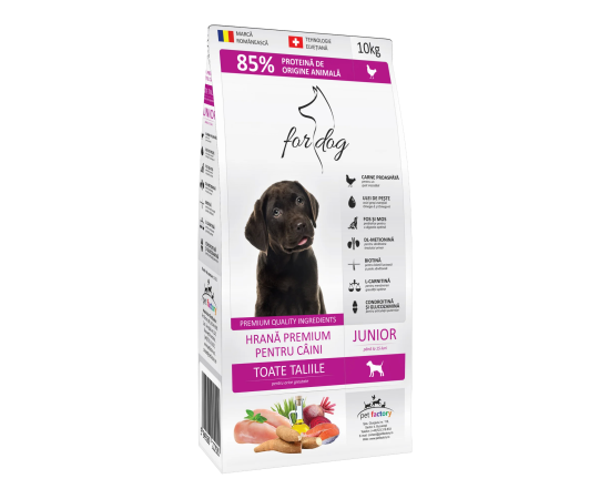 for dog Junior 10kg este o hrana uscata pentru caini de talie medie ce contine un procent ridicat de proteine de origine animala, carne proaspata si proteine de origine animala hidrolizate. Ingrediente Hrana Uscata Caini for dog Junior 10kg: Carne de pasare deshidratata, carne proaspata (min. 15%), carne de peste deshidratata, grau, grasime de pasare, ulei de peste, faina de sange, drojdie de bere deshidratata, proteine hidrolizate de pasare, pulpa de sfecla deshidratata, fructo-oligozaharide (FOS), mannan-oligozaharide (MOS), biotina, L-carnitina, sulfat de condroitina, glucozamina, extract de Yucca, vitamine si minerale. ADITIVI NUTRITIONALI: Vitamina A - 22.500 I.U.; Vitamina D3 , 2200 I.U.; Vitamina E , 61mg; Vitamina K3 , 1,50mg; Vitamina C , 70mg; Biotina - 0,30mg; Acid folic - 2mg; Vitamina B1 , 15mg; Vitamina B2 (Riboflavina) , 15mg, Vitamina B6 , 10mg, Vitamina B12 , 0,048mg, Niacinamida , 10mg; D-pantothenate de calciu , 30mg; L-carnitina , 100mg; Sulfat de fier (II) monohidrat , 80mg; Sulfat de cupru (II) pentahidrat , 50mg; Chelat de cupru (II) al aminoacizilor, hidrat , 30mg; Sulfat de mangan (II) monohidrat , 7mg; Chelat de mangan cu glicina, hidrat , 3mg; Sulfat de zinc monohidrat , 70mg; Chelat de zinc al aminoacizilor hidrat , 30mg; Iodura de calciu , 1,50mg; Seleniu , 0,05mg; DL , metionina - 5000mg; Acid citric , 0,20mg; Acid ortofosforic , 0,20mg. CONSTITUENTI ANALITICI: Proteina bruta , min. 31%, Grasime bruta , min 21%, Fibre brute , max. 3%, Umiditate , max. 10%, Calciu , min. 1,3%, Fosfor , min. 1%, Sodiu , min. 0,65%, antioxidanti autorizati UE. INSTRUCTIUNI DE HRANIRE: Recomandarile privind ratia zilnica de hrana sunt orientative, iar cainele ar putea avea nevoie de mai multa sau mai putina hrana, in functie de varsta, nivelul de activitate si temperament. S-ar putea sa fie nevoie sa ajustati aportul alimentar al cainelui dvs. in consecinta. Asigurati intotdeauna apa proaspata cainelui!