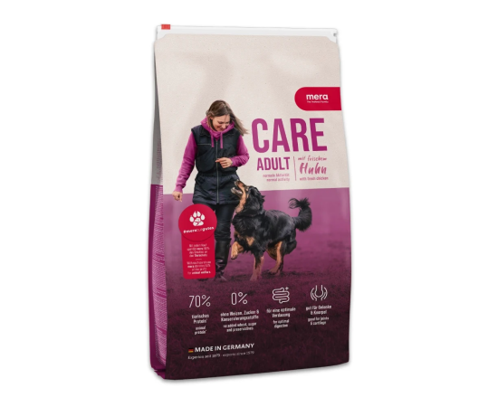 Mera Care Adult Pui 10Kg contine 70% proteina animala, optim pentru digestie, fara grau, zahar si conservanti. Beneficii: Piele Sanatoasa si blana lucioasa datorita raportului de Omega-3 si Omega-6 Articulatii si cartilaje mai elastic datorita glucozaminei si sulfatului de condroitina Sistem imunitar mai bine protejat datorita beta-glucanilor Ingrediente: Carne proaspata de pui (20%), proteine de pui (19%, partial uscate si hidrolizate), porumb, orez, faina de porumb, orz, seminte de in (2%), tescovina de mere (2,2%), minerale , grasime de pasare, celula de drojdie pereti (0,2 %, uscat, bogat in beta-glucani si manan-oligo-zaharide), inulina de cicoare (0,1%), glucozamina din tesut animal (0,02%), sulfat de condroitina (0,01%), ulei de somon (0,05%) ), ulei de floarea soarelui (0,05%). Carbonat de calciu, clorura de sodiu, clorura de potasiu, fosfat monocalcic Aditivi Nutritivi kg: Vitamin A - 12,000IU Vitamin D3 - 1,200IU vitamin E - 200mg vitamin C - 100mg Copper (sulfat de cupru (II), pentahidrat) - 12.5mg Zinc (sulfat de zinc, Monohidrat) - 100mg Zinc (glicina zinc chelat hidrat (solid)) - 40mg Iron (sulfat feros, monohidrat) - 250mg Manganese (sulfat de mangan(II), monohidrat) - 35mg Iod (iodat de calciu, anhidru) - 2.0mg, Seleniu (selenit de sodiu) - 0.35mg Aditivi tehnologici , antioxidant