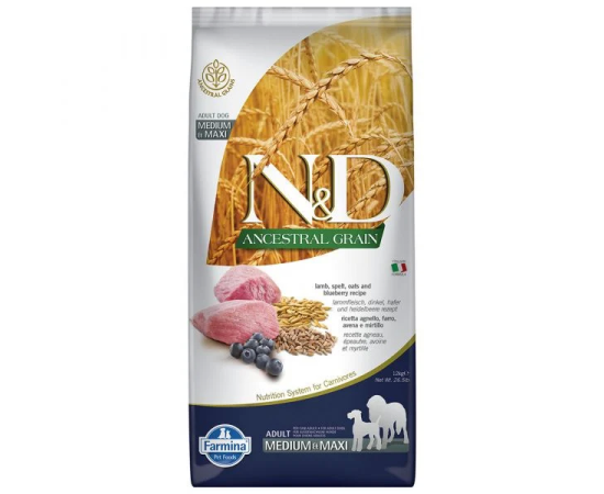 Farmina ND ANCESTRAL GRAIN Adult Medium Maxi - Miel, Alac, Ovaz si Afine 12kg este o hrana uscata completa si echilibrata pentru cainii adulti de talie medie si mare. INGREDIENTE: Miel proaspat dezosat (20%), miel deshidratat (18%), alac (10%), ovaz (10%), oua intregi deshidrate, hering proaspat, hering deshidratat, grasime de origine animala, ulei de peste(din hering), pulpa de sfecla uscata, fibre vegetale din mazare, morcovi uscati, lucerna uscata, inulina, fructooligoaharide, extract de drojdie (sursa de mannan-oligozaharide), afine uscate (0.5%), mar uscat, rodie uscata, portocala uscata, spanac uscat, psyllium (0.3%), clorura de sodiu, drojdie de bere uscata, radacina de turmeric (0.2%), glucozamina, sulfat de condroitina. ADITIVI PER KG: Aditivi nutritionali: Vitamina A 15000UI; Vitamina D3 1500UI; Vitamina E 600mg; Vitamina C 150mg; Niacina 37.5mg; acid pantotenic 15mg; Vitamina B2 7.5mg; Vitamina B6 6mg; Vitamina B1 4.5mg; Vitamina H 0.38mg; acid folic 0.45mg; Vitamina B12 0.1mg; clorura de colina 2500mg; Beta-caroten 1.5mg; chelat de zinc al analogului hidroxilat al metioninei 910mg; chelat de mangan al analogului hidroxilat al metioninei 380mg; chelat feros al hidratului de glicina 250 mg; chelat de cupru al analogului hidroxilat al metioninei 88mg; drojdie seleniata inactivata 0,40 mg; DL-metionina 4000mg; Taurina 1000mg; L-carnitina 300 mg. Aditivi organoleptici: extract de aloe vera 1000mg; extract de ceai verde 100mg; extract de rozmarin. Antioxidanti: extracte bogate in tocoferoli de origine naturala. VALORI ANALITICE: Proteina bruta 28,00%; grasimi si uleiuri brute 18,00%; Fibre brute 2,90%; umiditate 9,00%; cenusa bruta 8,20%; Calciu 1,40%; Fosfor 1,10%; Omega-6 3,30%; Omega-3 0,90%; DHA 0,50%; EPA 0,30%; Glucozamina 1200mg kg; Sulfat de condroitina 900 mg kg. VALOARE ENERGETICA: EM Kcal Kg 3941 - Mj Kg 16,49