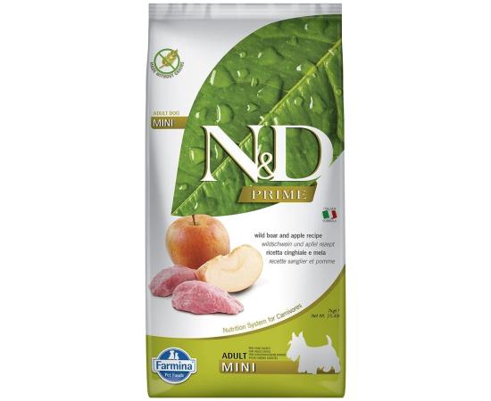 ND Prime este gama Farmina cu 98% proteine de origine animala, 0% conservanti artificiali, 0% cereale. Previne obezitatea si diabetul datorita indicelui glicemic scazut obtinut prin absenta cerealelor, permitand o eliberare treptata de energie pe parcursul zilei. In timpul procesului de ambalare, azotul este introdus in sacul de hrana pentru a inlocui oxigenul, astfel asigurand o conservare naturala a produsului. Toate formularile sunt dovedite stiintific si testate clinic prin cercetari certificate Cruelty-Free. Descarca ghidul de hranire aici. (https: www.farmina.com fotoprodotti dosi 96_54_nd-grain-free-canine-5-wild-boar-mini.pdf) DIMENSIUNE CROCHETA: Diametru 8-10 mm - Grosime 4-6 mm INGREDIENTE: Carne proaspata si dezosata de mistret(22%), carne de mistret deshidratata (20%), cartofi, carne proaspata si dezosata de pui, carne de pui deshidratata, grasime de pui, oua integrale deshidratate, peste deshidratat, ulei de peste, fibre vegetale din mazare, morcovi uscati, lucerna uscata, inulina, fructooligozaharide, mananoligozaharide, mar deshidratat(0.5%), pudra de rodie, portocala deshidratata, pudra de spanac, psyllium(0.3%), pudra de coacaze (0.3%), pudra de afine, clorura de sodiu, drojdie de bere uscata, radacina de turmeric(0.2%), glucozamina, sulfat de condroitina, extract de galbenele(sursa de luteina). ADITIVI PER KG: Aditivi nutritionali: Vitamina A 15000 UI; Vitamina D3 1500 UI; Vitamina E 600mg; Vitamina C 150mg; Niacina 37.5mg; acid pantotenic 15mg; Vitamina B2 7.5mg; Vitamina B6 6mg; Vitamina B1 4.5mg; Vitamina H 0.38mg; acid folic 0.45 mg; Vitamina B12 0.1mg; clorura de colina 2500mg; Beta-caroten 1.5mg; chelat de zinc al analogului hidroxilat al metioninei 910mg; chelat de mangan al analogului hidroxilat al metioninei 380mg; chelat feros al hidratului de glicina 250 mg; chelat de cupru al analogului hidroxilat al metioninei 88mg; seleniometionina 0.40mg; Dl-Metionina 4000mg; Taurina 1000mg; L-carnitina 300mg. Aditivi organoleptici: extract de aloe vera 1000mg; extract de ceai verde 100mg; extract de rozmarin. Antioxidanti: extracte bogate in tocoferoli naturali. VALORI ANALITICE Proteina bruta 37.00%; grasimi si uleiuri brute 18.00%; Fibre brute 2.60%; cenusa bruta 7.90%; Calciu 1.30%; Fosfor 0.90%; Omega-6 3.30%; Omega-3 0.90%; DHA 0.50%; EPA 0.30%; Glucozamina 1200mg kg; Condroitina 900mg kg. VALOARE ENERGETICA EM Kcal Kg 3995 - Mj Kg 16,71