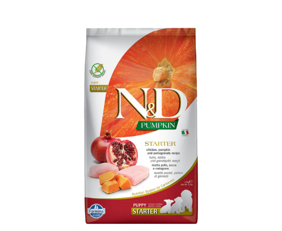 ND Pumpkin Starter Puppy Pui si Rodie 2,5kg este o hrana uscata completa pentru catei in perioada de intarcare pana la varsta de 2 luni. Ingrediente Hrana Uscata Caini ND Pumpkin Starter Puppy Pui si Rodie 2,5kg: Pui dezosat (24%), proteine de pui deshidratate (22%), amidon de mazare, grasime de pui, proteine de hering deshidratate, dovleac uscat (5%), hering, oua uscate, ulei de peste (din hering), cartilaj de pui (sursa de glucozamina si sulfat de condroitina), faina de lucerna, fibre de mazare, inulina de cicoare, fructooligozaharide, extract de drojdie (sursa de mannooligozaharide), fructe de rodie uscate (0.5%), morcov uscat, spanac uscat, mar uscat, seminte si coji de Psyllium, portocala dulce uscata, afine uscate, clorura de sodiu, drojdie de bere uscata, turmeric (0,2%), extract de aloe vera. COMPONENTE ANALITICE: Proteina bruta 30,00%; Grasime bruta 20,00%; Fibre brute 1,10%; Umiditate 9,00%, Cenusa bruta 7,90%; Calciu 1,10%; Fosfor 0,91%; Omega-6 3,20%; Omega-3 0,70%; DHA 0,40%; EPA 0,20%; Glucozamina 1200mg kg; Sulfat de condroitina 900mg kg. ADITIVI NUTRITIONALI: Vitamine, provitamine si alte substante cu compozitie chimica definita: Vitamina A (3a672b) 19200 UI; Vitamina D3 (E671) 1920 UI; Vitamina E (3a700) 720mg; Vitamina C (3a300) 192mg; Niacina (3a314) 48mg; D-pantotenat de calciu (3a841) 19.2mg; Vitamina B2 9.6mg; Vitamina B6 (3a831) 7.7mg; Vitamina B1(3a820) 5.8mg; Biotina (3a880) 0.48mg; Acid folic (3a316) (3a316) 0.58mg; Vitamina B12 0.12mg; Clorura de colina (3a890) 2800mg; Beta-caroten [3a160(a)] 1.5mg. Amestecuri de oligoelemente: zinc (chelat de zinc cu analogul hidroxilat de metionina) (3b6.10): 163,8 mg; mangan (chelat de mangan cu analogul hidroxilat al metioninei) (3b5.10): 64,6 mg; fier [chelat glicinic de fier (II) hidrat] (3b108): 58,3 mg; cupru (chelat de cupru cu analogul hidroxi al metioninei) (3b4.10): 15,8 mg; seleniu (drojdie inactivata imbogatita cu seleniu) (3b811): 0.00088mg. Aminoacizi, sarurile lor si produsele conexe: DL-metionina, tehnic pura (3c301) 6000mg; taurina (3a370) 1000mg; clorhidrat de L-lizina, tehnic pura (3.2.3) 400mg, L-cistina (3c391) 400mg; L-carnitina (3a910) 300mg. Aditivi senzoriali: extract de ceai verde 100mg; extract de rozmarin. Antioxidanti: extracte de tocoferol din uleiuri vegetale.