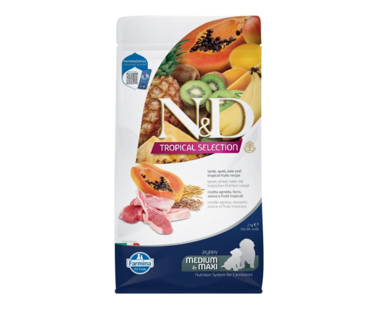 ND Tropical Selection Medium Maxi Puppy Miel 2kg este o hrana uscata completa pentru cainii juniori de talie medie si mare. Ingrediente Hrana Uscata Caini ND Tropical Selection Medium Maxi Puppy Miel 2kg: Carne de miel (20%), proteine de miel deshidratate (20%), spelt (10%), ovaz (10%), grasime de pui, proteine de hering deshidratate, pulpa de sfecla uscata, ulei de peste (din hering), morcov uscat, faina de lucerna, cartilaj de pui (sursa de glucozamina si sulfat de condroitina), inulina, fructo-oligozaharide, extract de drojdie (sursa de manno-oligozaharide), banane uscate (0. 5%), kiwi uscat (0,5%), mango uscat (0,5%), papaya uscat (0,5%), ananas uscat (0,5%), spanac uscat, coji si seminte de psyllium, clorura de sodiu, drojdie de bere uscata, turmeric, extract de aloe vera. COMPONENTE ANALITICE: Proteina bruta 30,00%; grasime bruta 20,00%; fibre brute 2,70%; umiditate 9,00%; cenusa bruta 8,00%; calciu 1,15%; fosfor 0,95%; Omega-6 3,20%; Omega-3 0,60%; DHA 0,20%; EPA 0,15%; glucozamina 1200mg kg; sulfat de condroitina 900mg kg. ADITIVI NUTRITIONALI: Aditivi nutritionali: Vitamina A 12000IU; Vitamina D3 1200IU; Vitamina E 120mg; Vitamina C 120mg; Niacina 30mg; D-pantotenat de calciu 12mg; Vitamina B2 6mg; Vitamina B6 4,8mg; Vitamina B1 3,6mg; Biotina 0,30mg; Acid folic 0,36mg; Vitamina B12 0,048mg; Clorura de colina 2500mg; Zinc (oxid de zinc): 86,7mg; Zinc (sulfat de zinc monohidrat): 43,7mg; Mangan (sulfat manganos monohidrat): 48,8mg; Fier [Sulfat de fier (II) monohidrat]: 14,5mg; Fier [Carbonat de fier (II)]: 28,9mg; Cupru [Sulfat de cupru (II) pentahidrat]: 12,8mg; Iod [iodat de calciu anhidru]: 1,56mg; Seleniu (selenit de sodiu): 0,101mg; DL-metionina, pura din punct de vedere tehnic 2500mg. Aditivi senzoriali: extract de ceai verde 100mg; extract de rozmarin. Antioxidanti: extracte de tocoferol din uleiuri vegetale.