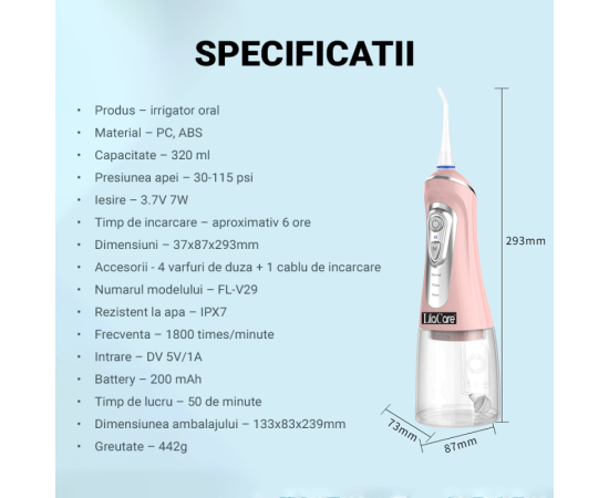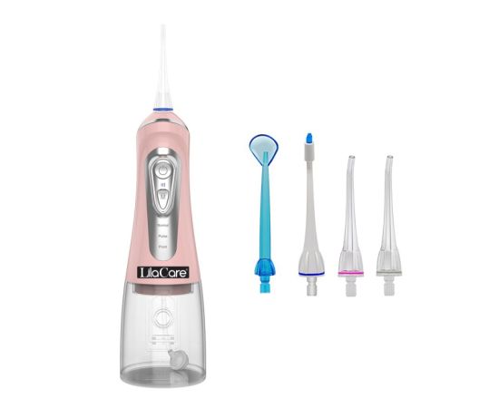 Irigator oral Lila Care, portabil, USB, jet de apa dentar, 3 moduri, rezervor de apa impermeabil dinti, 4 capete inlocuibile, 320ML, Roz