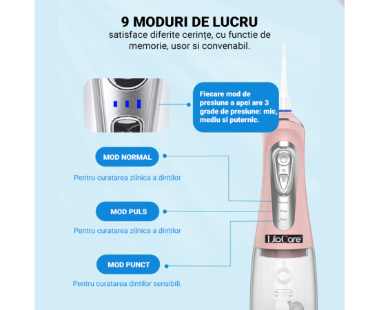 Cele 9 Moduri de Lucru fac din acest produs Irigatorul Oral potrivit pentru fiecare persoana in parte!
