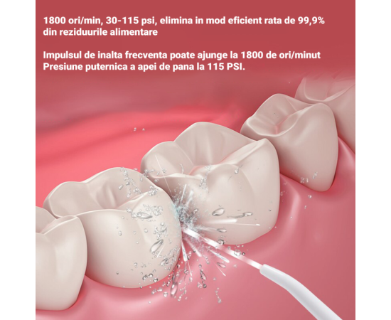 4. Functia Pulse Presiunea 1: Ideal pentru curatarea gingiilor si masaj intensitate mica (presiune 30-60 psi)