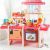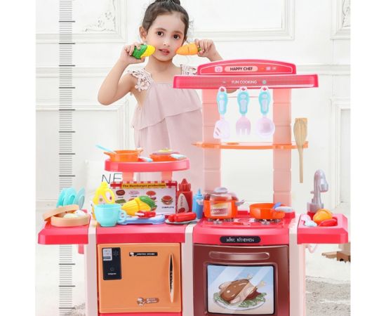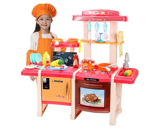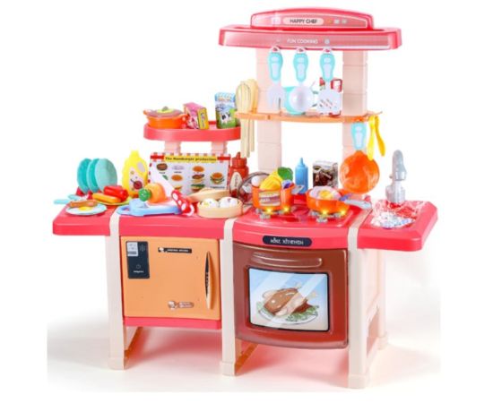 Bucatarie Dubla Completa Multifunctionala Karemi, Chiuveta cu Circuit de Apa, Masina de Spalat Vase, Cuptor, Oala sub Presiune, Ustensile, Produse, Legume, Lumini si Sunete, 42 piese, Roz / Portocaliu
