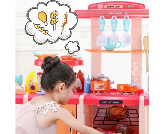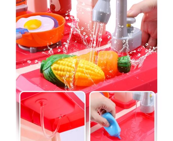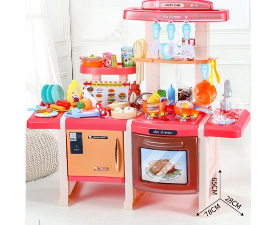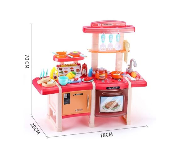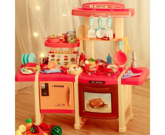 Aragazul are doua zone de gatit si scoate sunete si lumini atunci cand este folosit. Langa acesta este chiuveta, iar la o apasare de buton apa va curge exact ca la robinet.