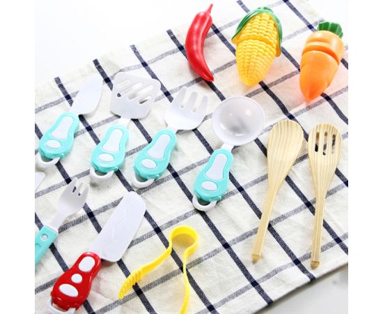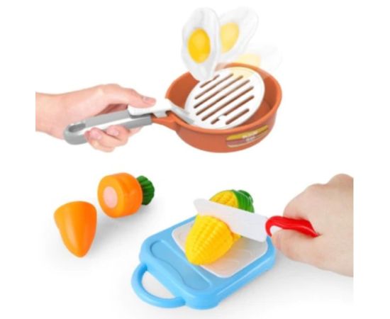 In set sunt incluse toate accesoriile de care micii bucatari au nevoie precum si materie prima pentru gatit (oua, peste, legume).