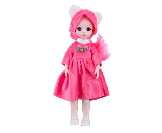 Papusa are o rochita si o caciulita, fiind potrivita pentru povestile unui tinut indepartat, pe timp de iarna.