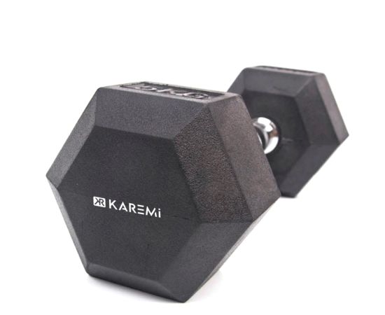 Gantera dumbbell Karemi, tip hexagon, de 10 kg are o constructie solida si este potrivita pentru antrenamentul acasa sau la sala. Datorita suprafetei cauciucate, gantera nu este zgomotoasa in timpul manevrarii, asigura o depozitare mai usoara si va fi stabila pe sol, sau alte suprafete plate.