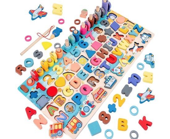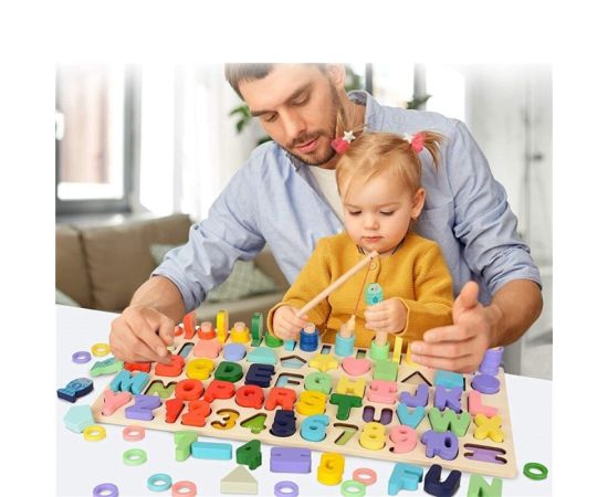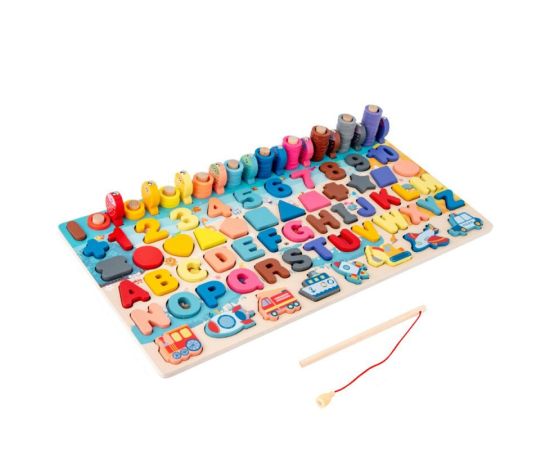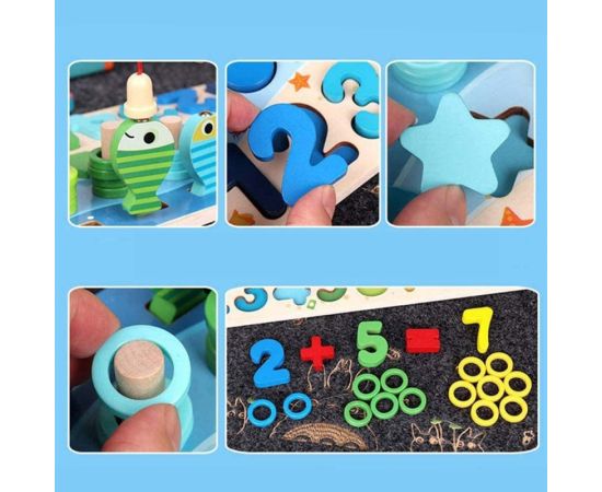 Puzzle Karemi 7 in 1, din lemn cu magneti, joc pescuit, joc de ortografie, invatare numere, joc educativ pentru copii peste 3 ani, K01B-10138