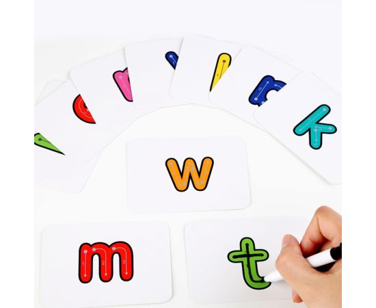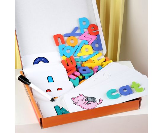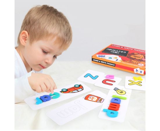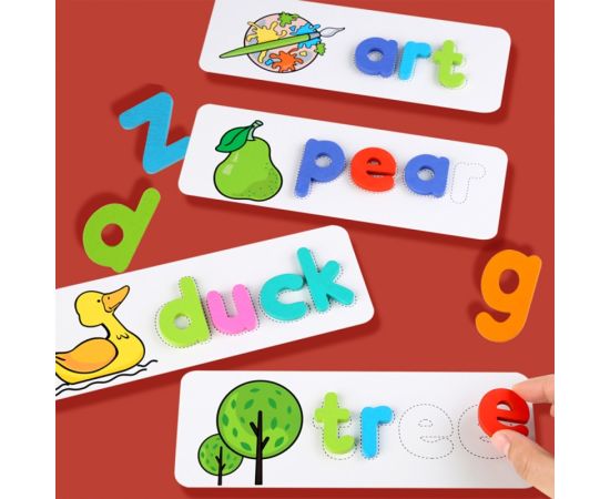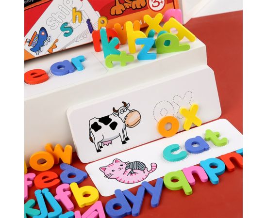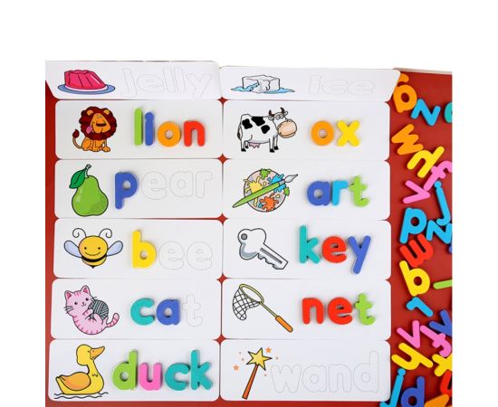 Jocul contine cartonase cu litere, iar cel mic trebuie sa gaseasca literele corespunzatoare si sa le puna in pe cartonase. Acesta contine cuvinte uzuale in limba engleza si poze pentru a da o identitate vizuala cuvantului scris.