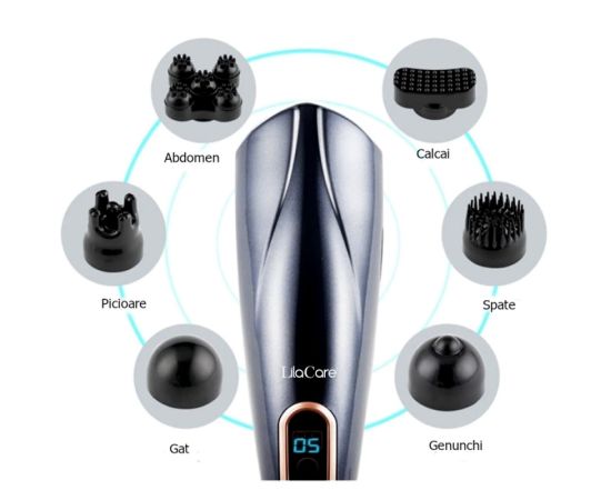 Aparat de masaj Lila Care, pentru spate, umeri, picioare, maini, gat, abdomen, cu 6 capete detasabile, 24 W, gri