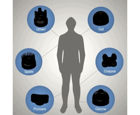 Cele 6 capete de masaj detasabile ofera 6 moduri diferite de masaj pentru fiecare zona a corpului.