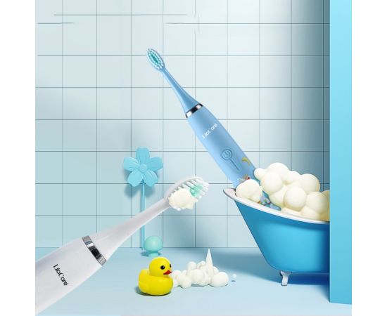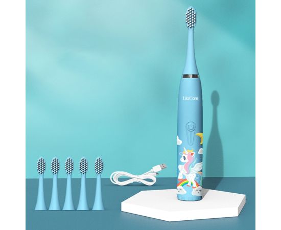 Periuta de dinti electrica LilaCare, pentru copii, rezistent la apa, cu incarcare USB, 6 capete inlocuibile, 4 moduri de vibratii, albastru deschis