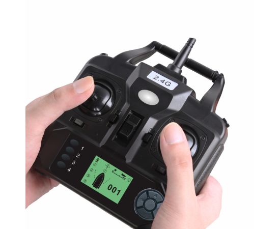 Telecomanda are antena incorporata si baterie litiu, aceasta controland viteza si directiile barcii.