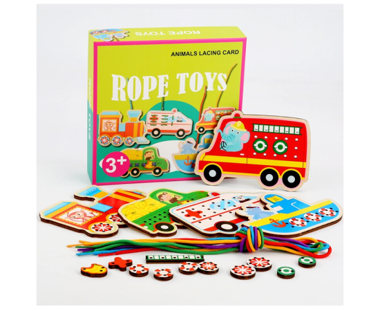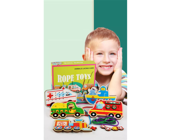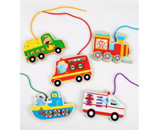 Puzzle educativ cu snururi Karemi, model mijloace transport, multicolor