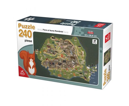 Cutia contine un puzzle de 240 piese din care poate fi asamblata o imagine cu flora si fauna Romaniei.