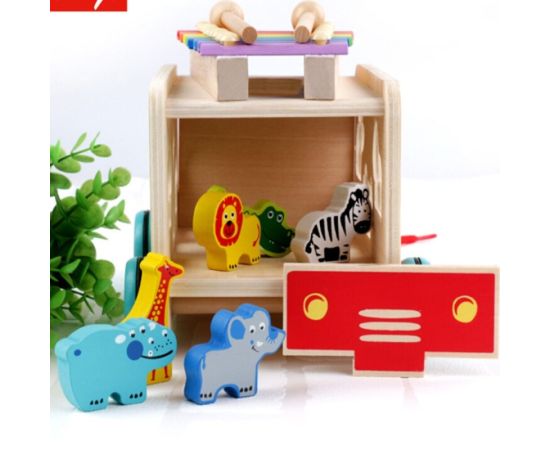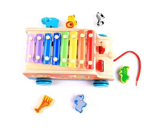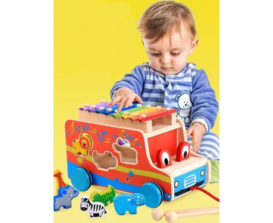 Xilofon si puzzle cu forme de animale. Camionul are un snur pe care copilul tau il poate folosi pentru a plimba camionul dupa el.