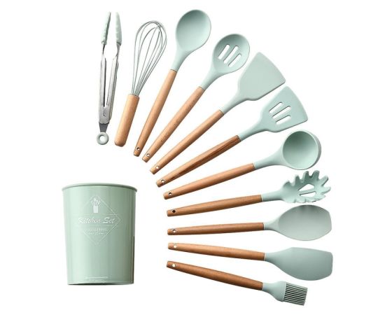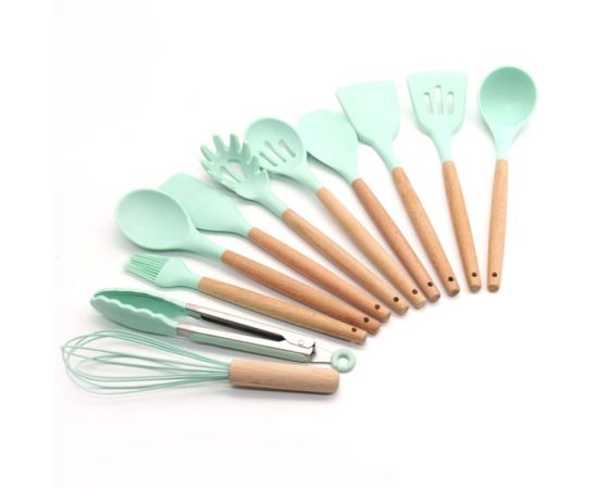 Set 12 ustensile de bucatarie din silicon termorezistent si maner din lemn natural