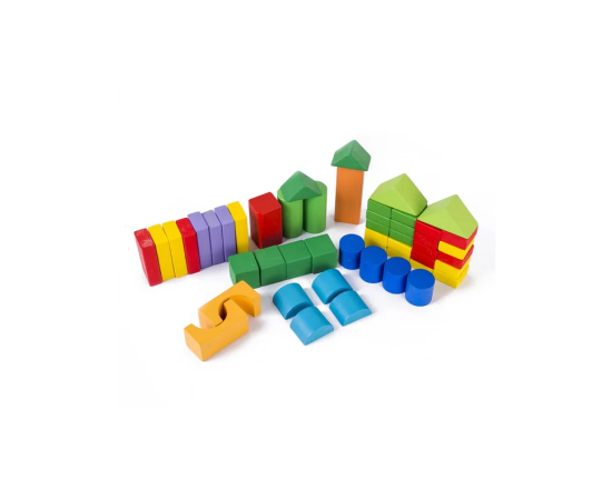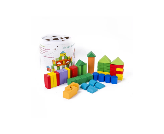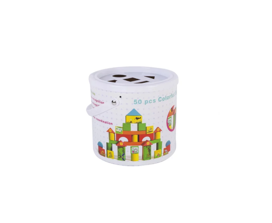Galetusa cu 50 piese cuburi colorate din lemn, pentru construit.Piesele din lemn sunt de diferite forme si dimensiuni.