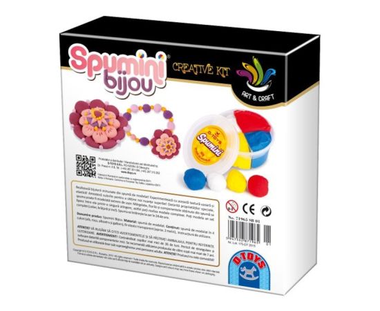 Spumini este o spuma de modelat noua, cu totul speciala, super fina si pufoasa. Are o textura usoara si elastica, oferind o placere tactila deosebita. Datorita proprietatilor speciale, spuma poate fi modelata extrem de usor. Culorile pot fi amestecate pentru a obtine noi nuante superbe. Se intareste la aer in 24 ore mentinandu-si culoarea, textura fina si toate detaliile mici.