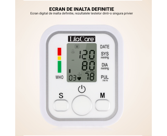 Tensiometru electronic de brat Lila Care, 99 memorari, display digital LCD, alb.