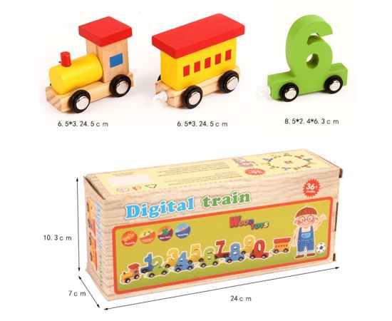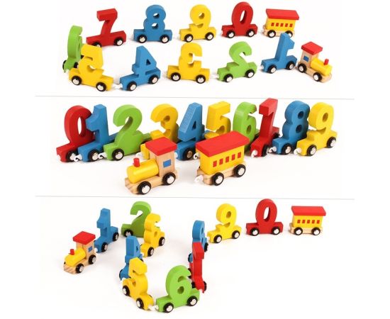 Trenuletul include o locomotiva si 10 vagoane, cu cifrele de la 0 la 9, fiecare colorata in mod diferit, care pot fi prinse cu ajutorul dispozitivelor din plastic ce se afla in fata si spatele fiecarei piese.